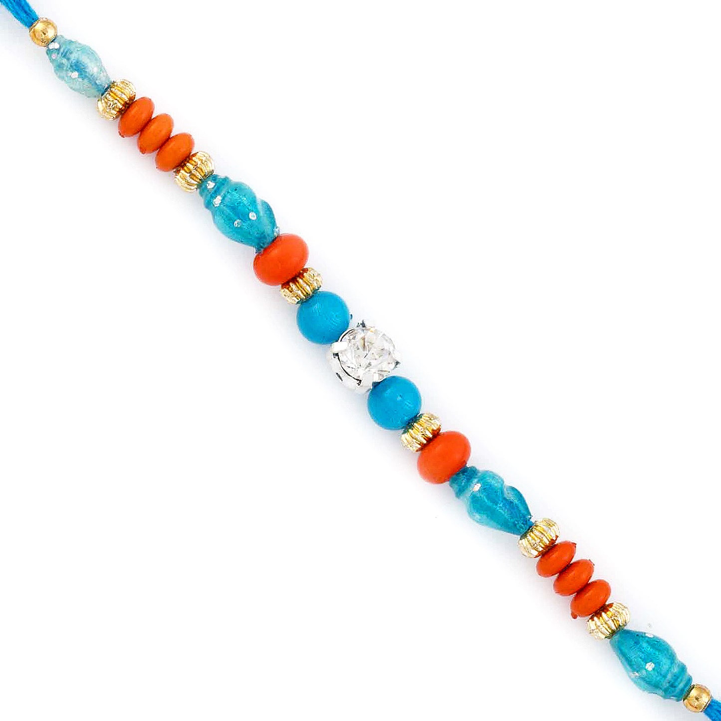 Blue & Orange Dual Shade Pretty Rakhi for this auspicious Raksha Bandhan to send to your beloved brother with Tilak Pack. Rakshabandhan is a festival of celebrating and honouring sibling love. AAPNO RAJASTHAN brings home-spun Rakhis prepared in the time honored tradition and with same love & care that matches sisterly love..; The Set Contains- 1 Traditional Mauli Thread Rakhi::1 Pack of Roli ::1 Paper Rakhi Card .