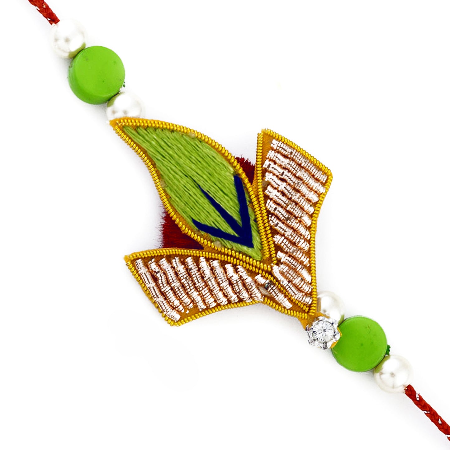 Aapno Rajasthan Bright Green Leaf Shape Zardozi Rakhi