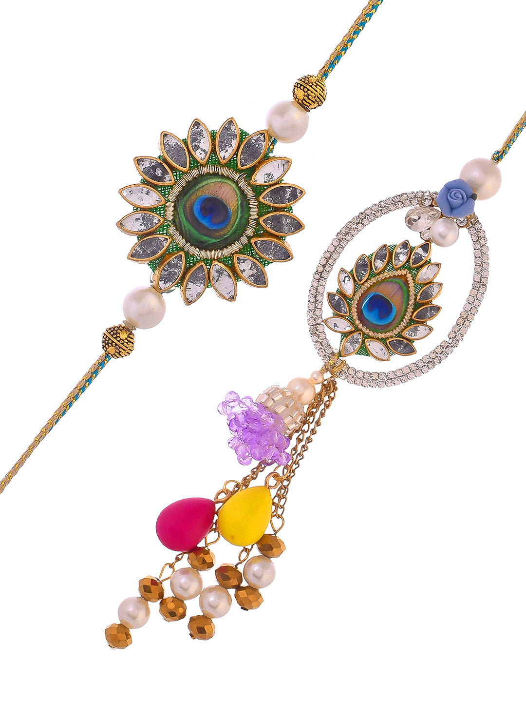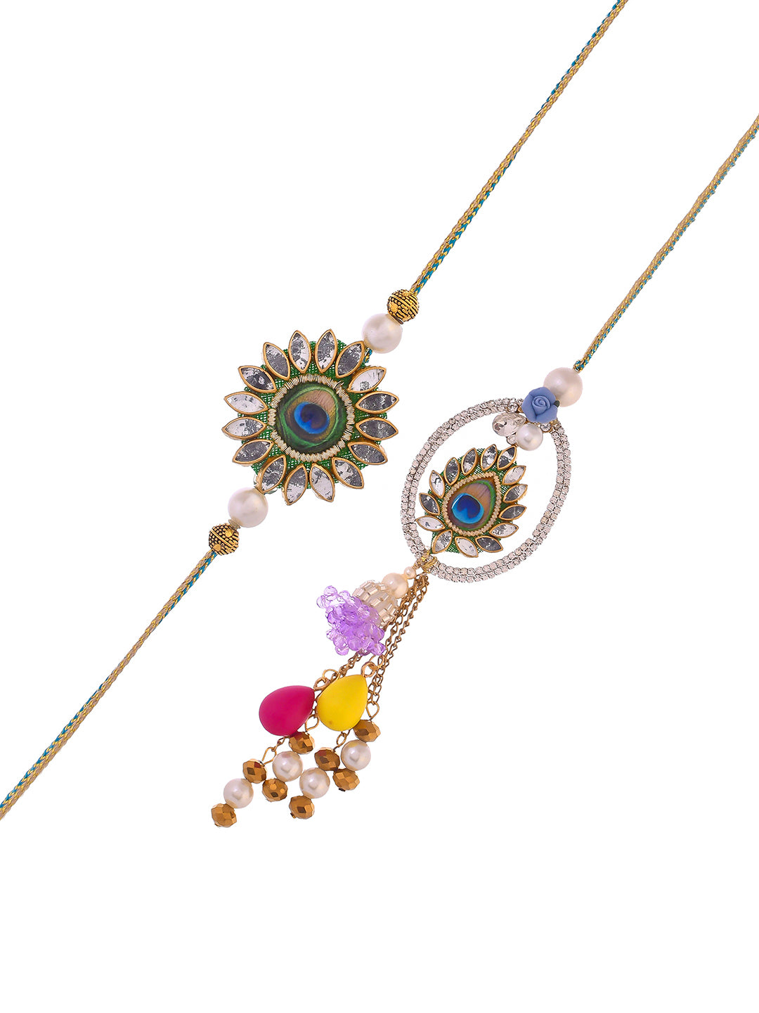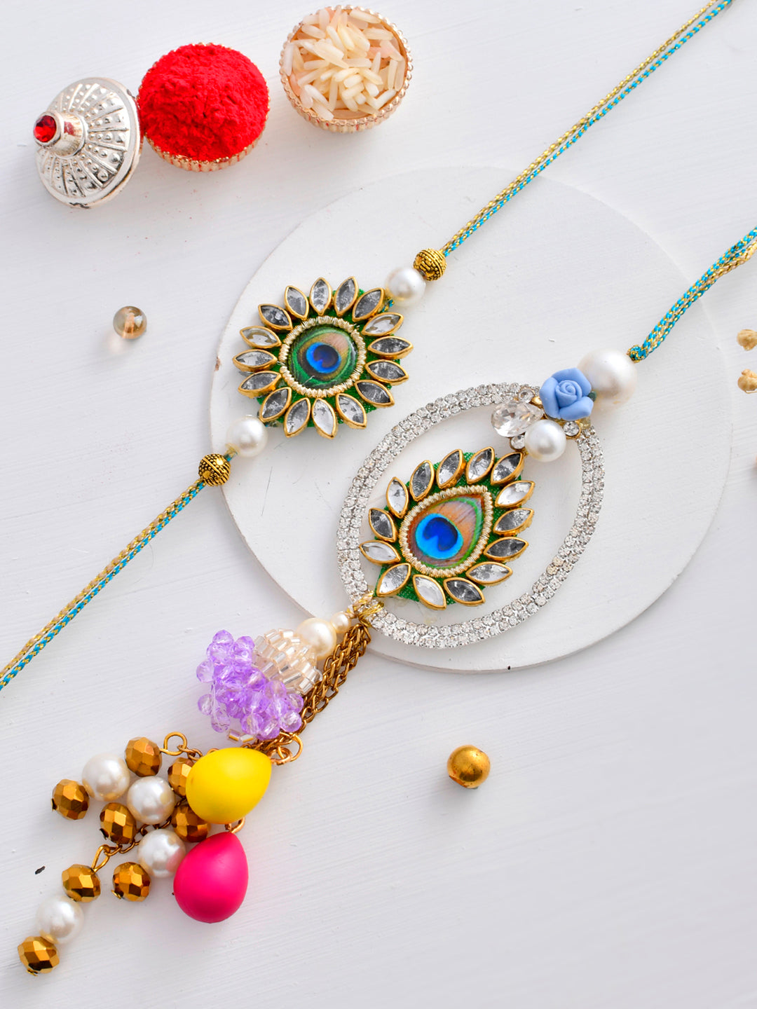 Antique Kundan Meena Heavily Embellished Lumba with Crafted Bhaiya Bhabhi Rakhi Set