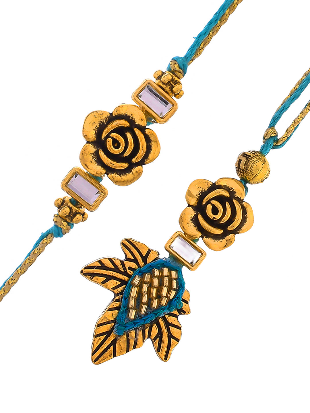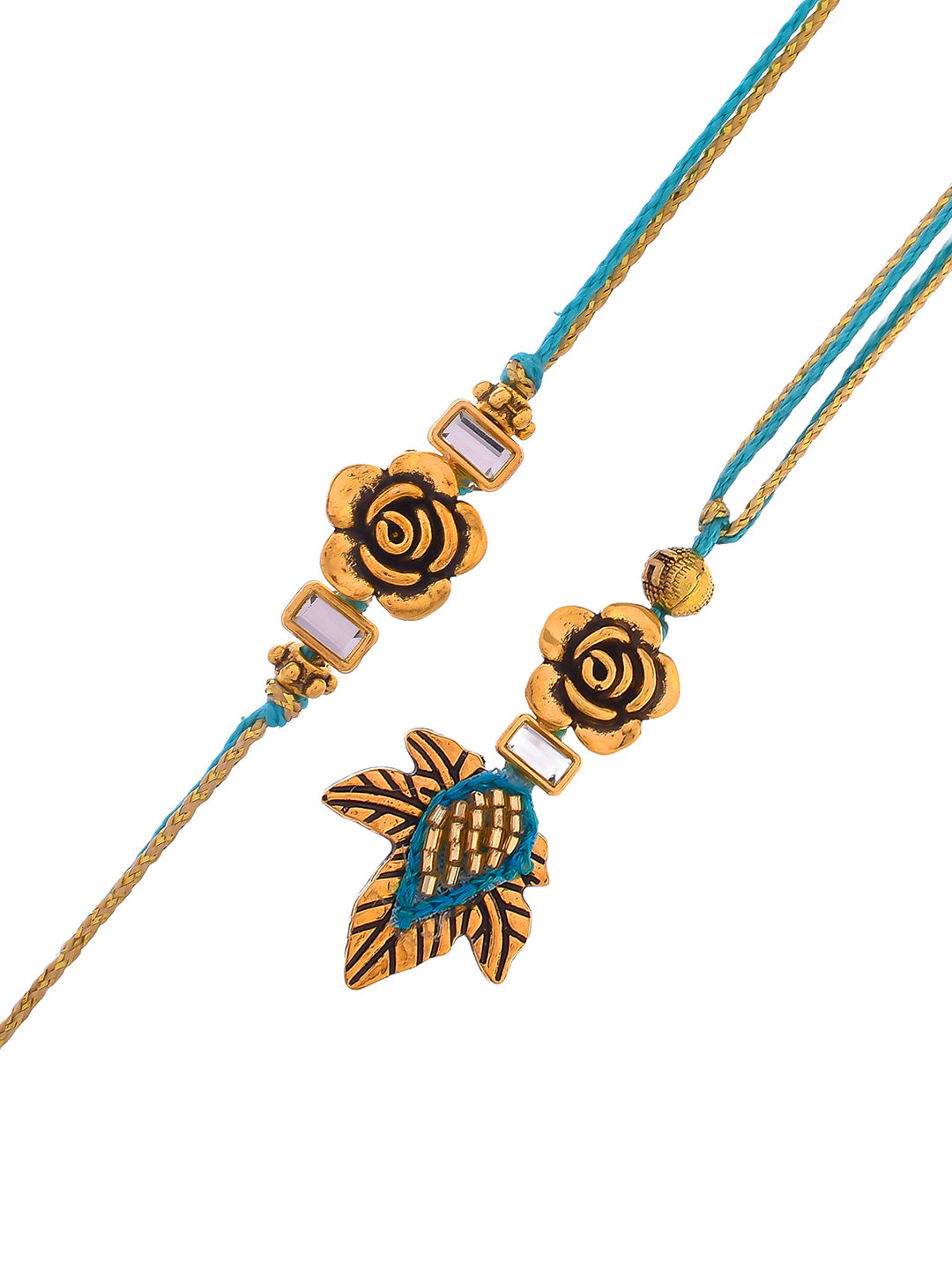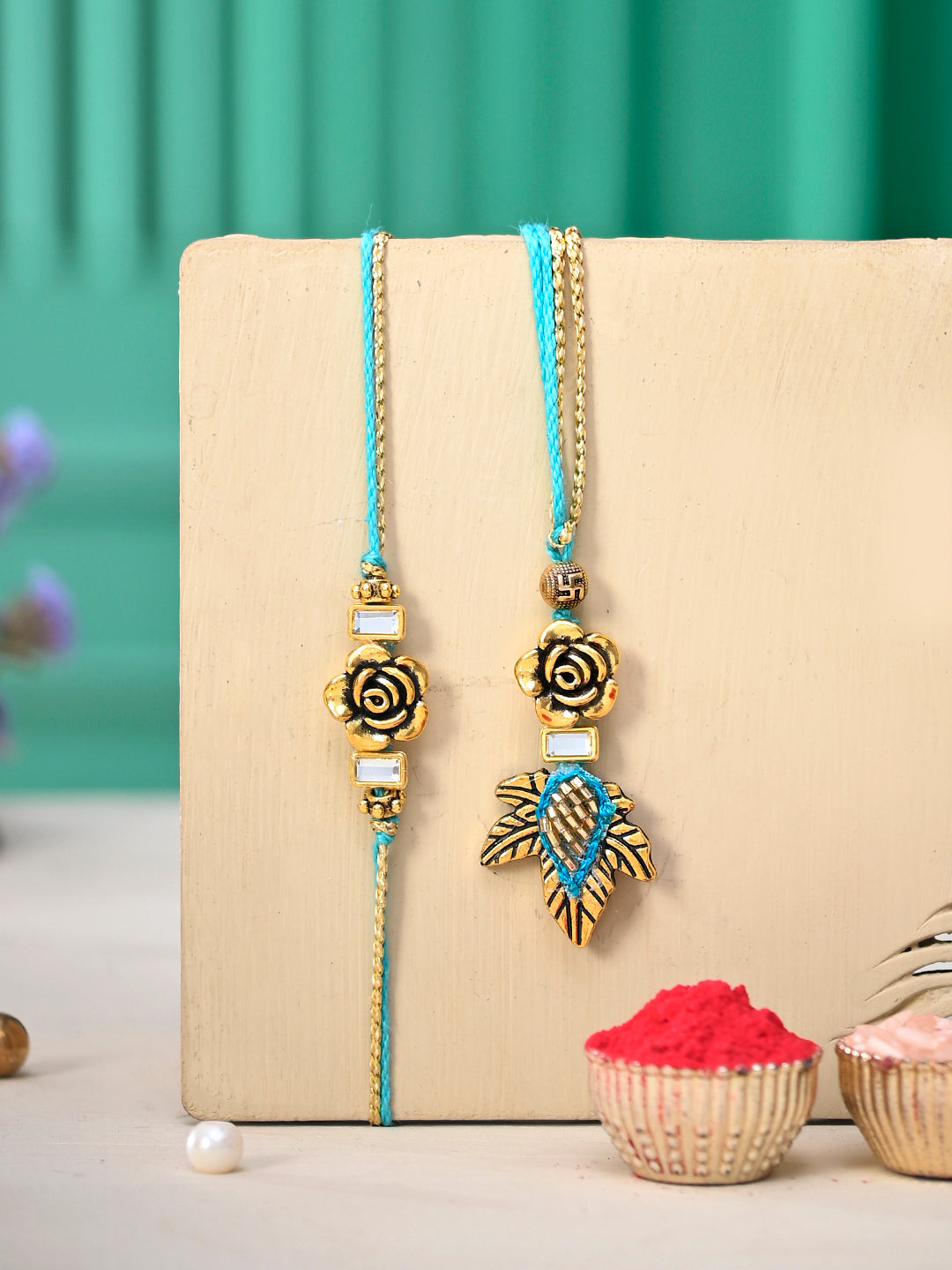 Beautiful Gold Rose & Leaf Bhaiya Bhabhi Rakhi Set