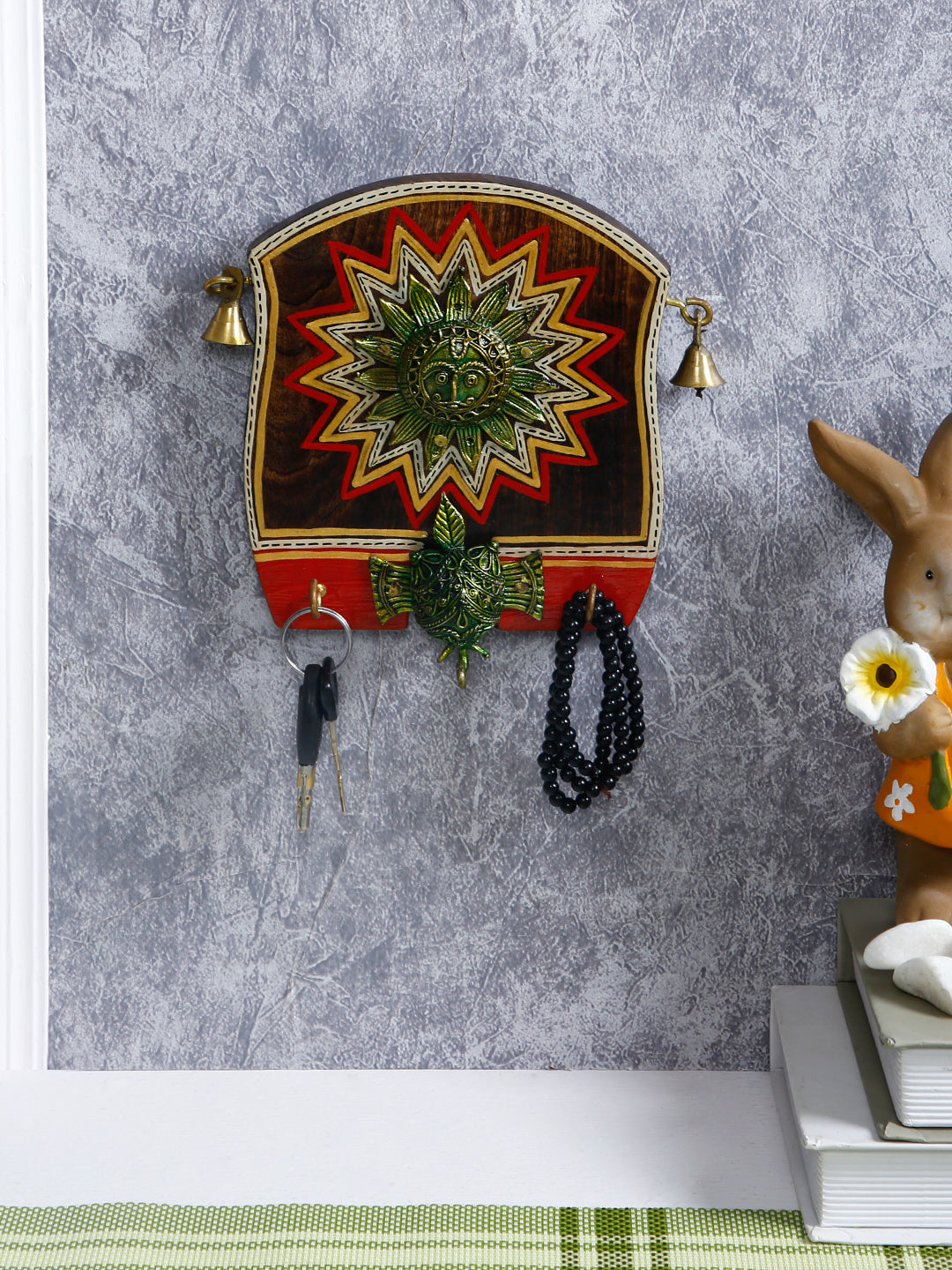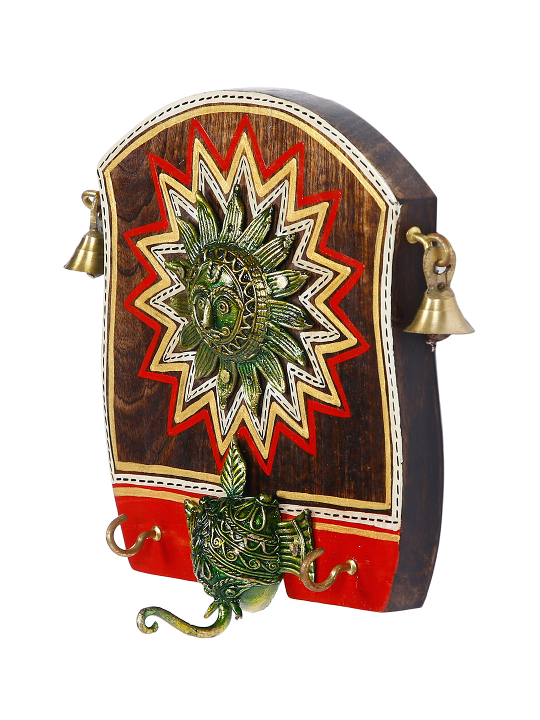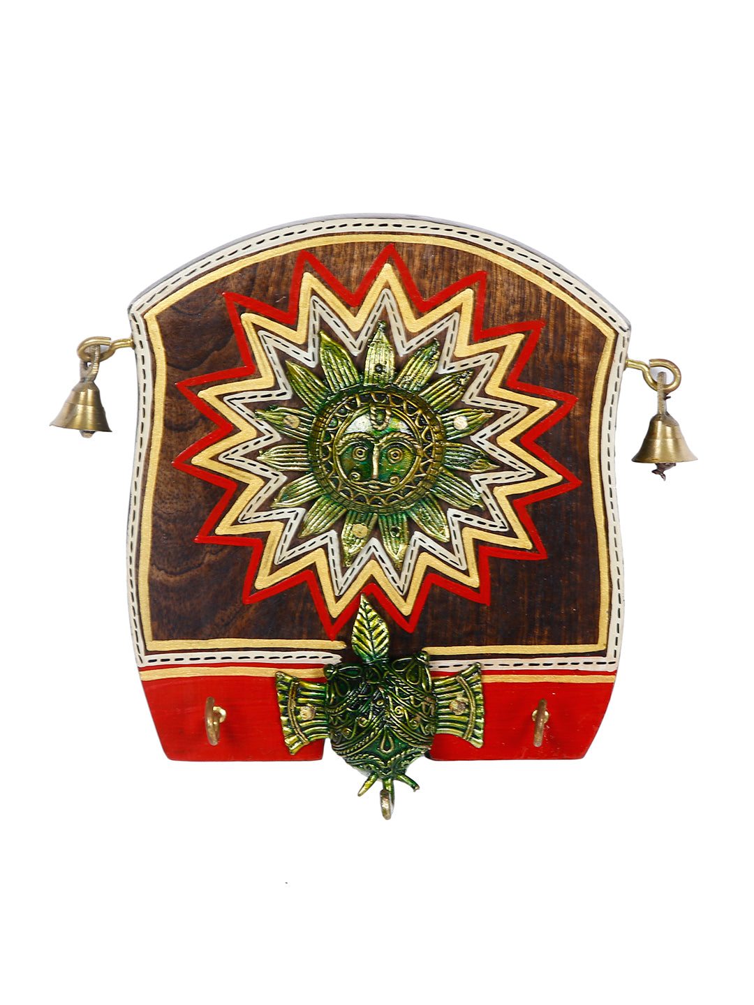 Beautiful Wooden panel Key Holder with Sun Motif! The amazing design of a universal truth "SUN" on this key holder gives the feel of tradition in the room and the figures are made out of metallic touch. Artificial small hanging bells gives it an unique look. 2 Hooks are availble in this key holder.