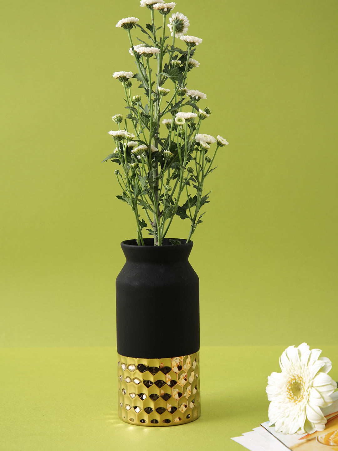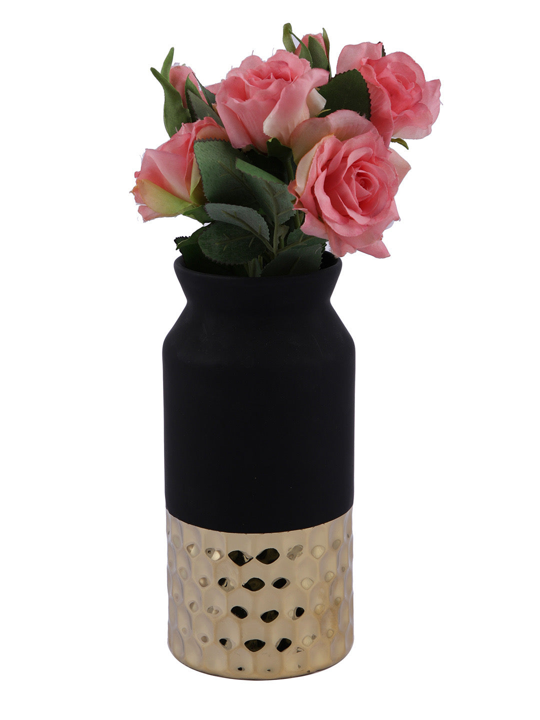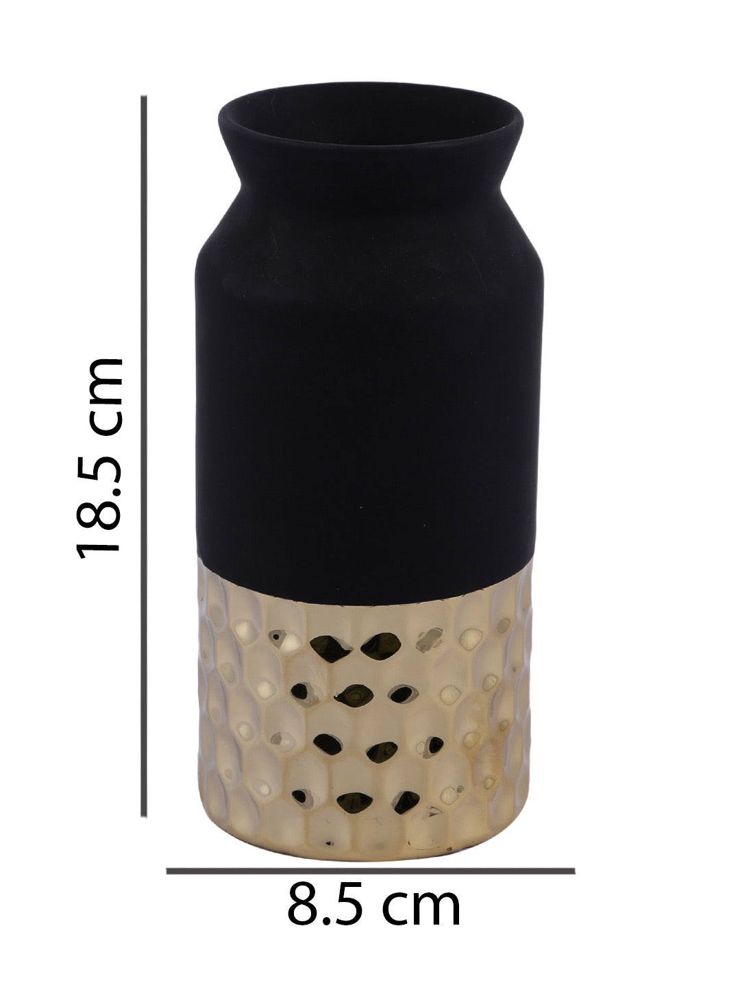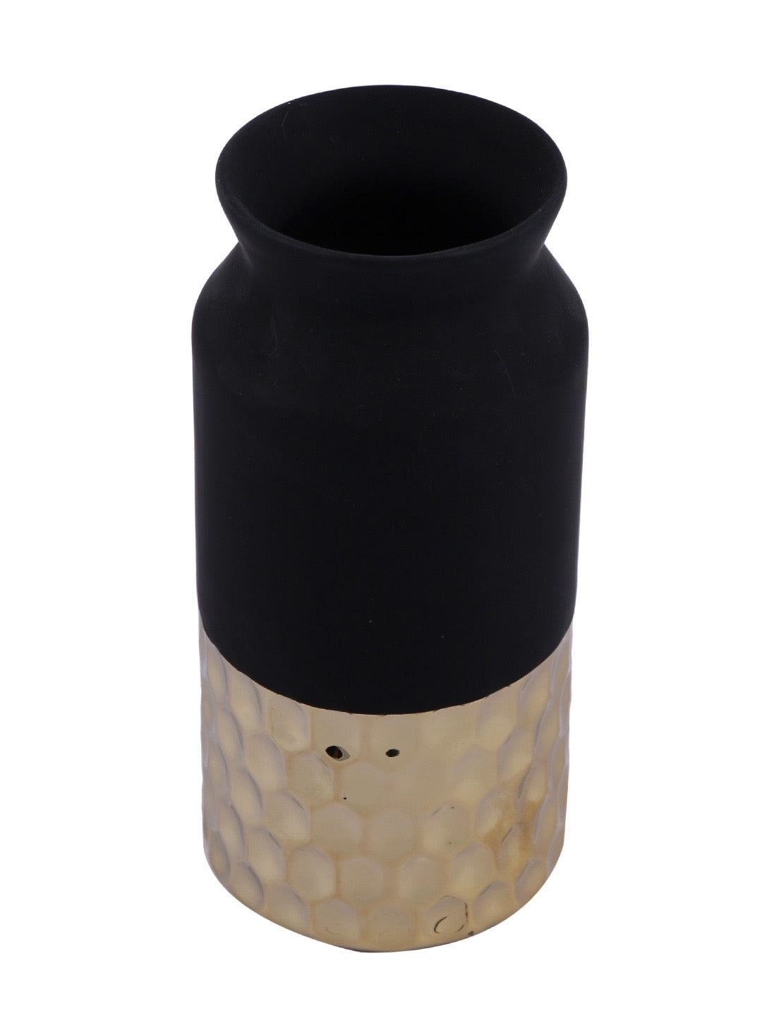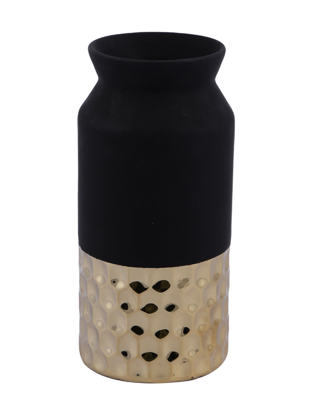 • This lovely dual shade vase has a golden color at bottom with dimples and a matte black upper side.