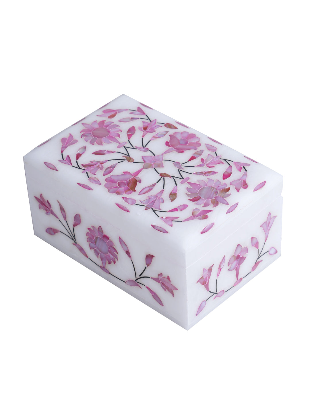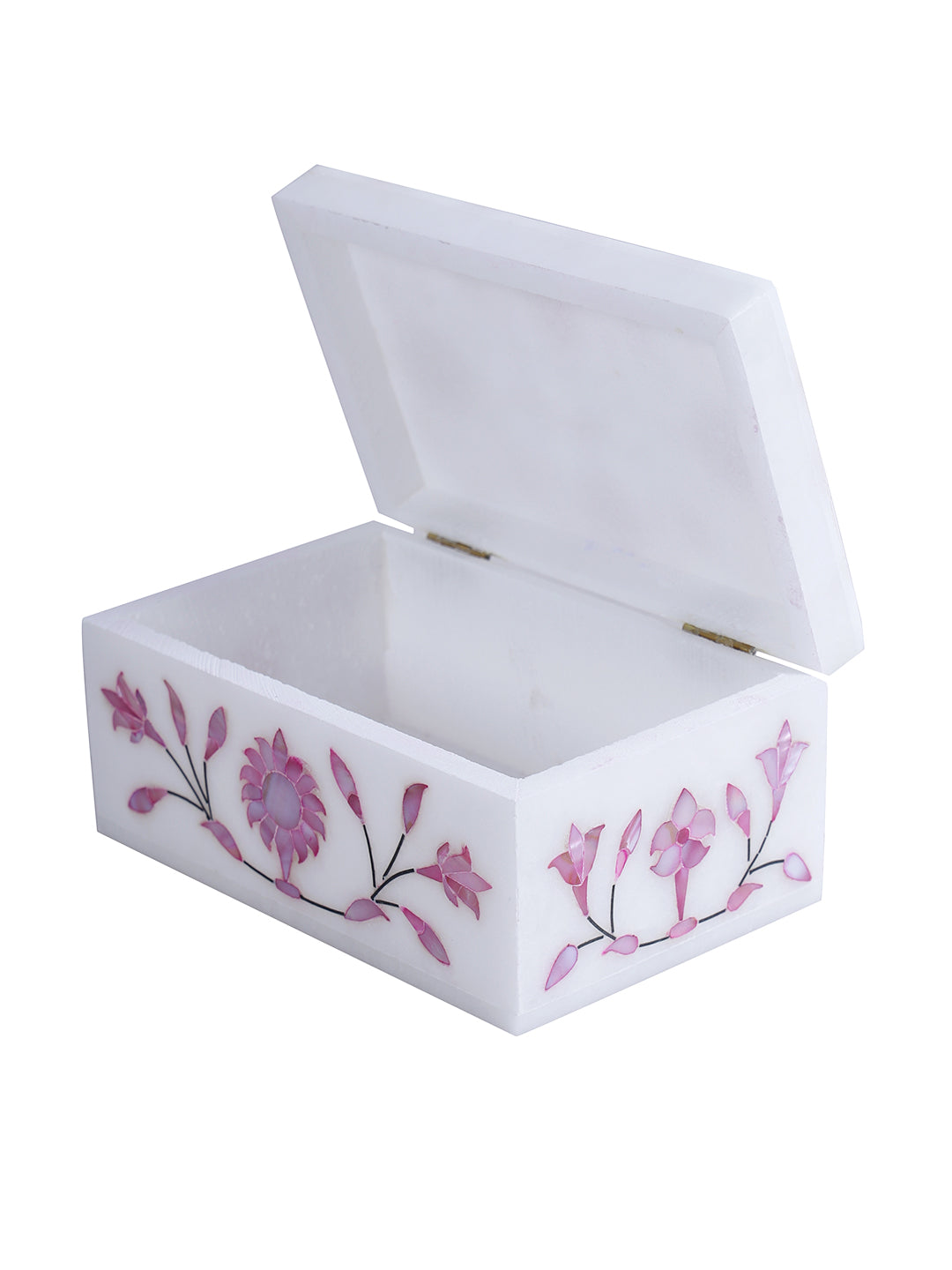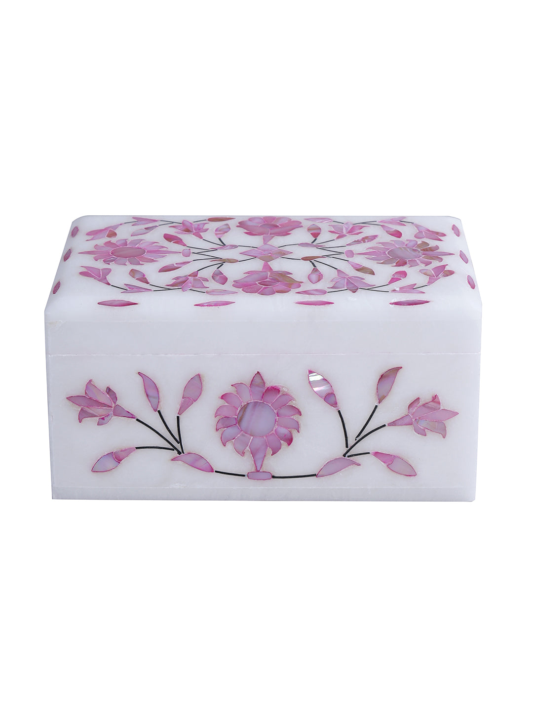 Set Content: 1 Jewelry Box/Organizer Material: Marble • A beautiful and attractive marble inlay rectangular box with pink floral motifs adds just that lovely touch of class. • A perfect piece for your dressing rooms/tables to store fine jewellery pieces. • It could be a great option for gifting or décor also. Disclaimer • As this product is handcrafted there might be a slight variation which is natural outcome and hence makes the product unique. • Clean with a soft and dry cloth.