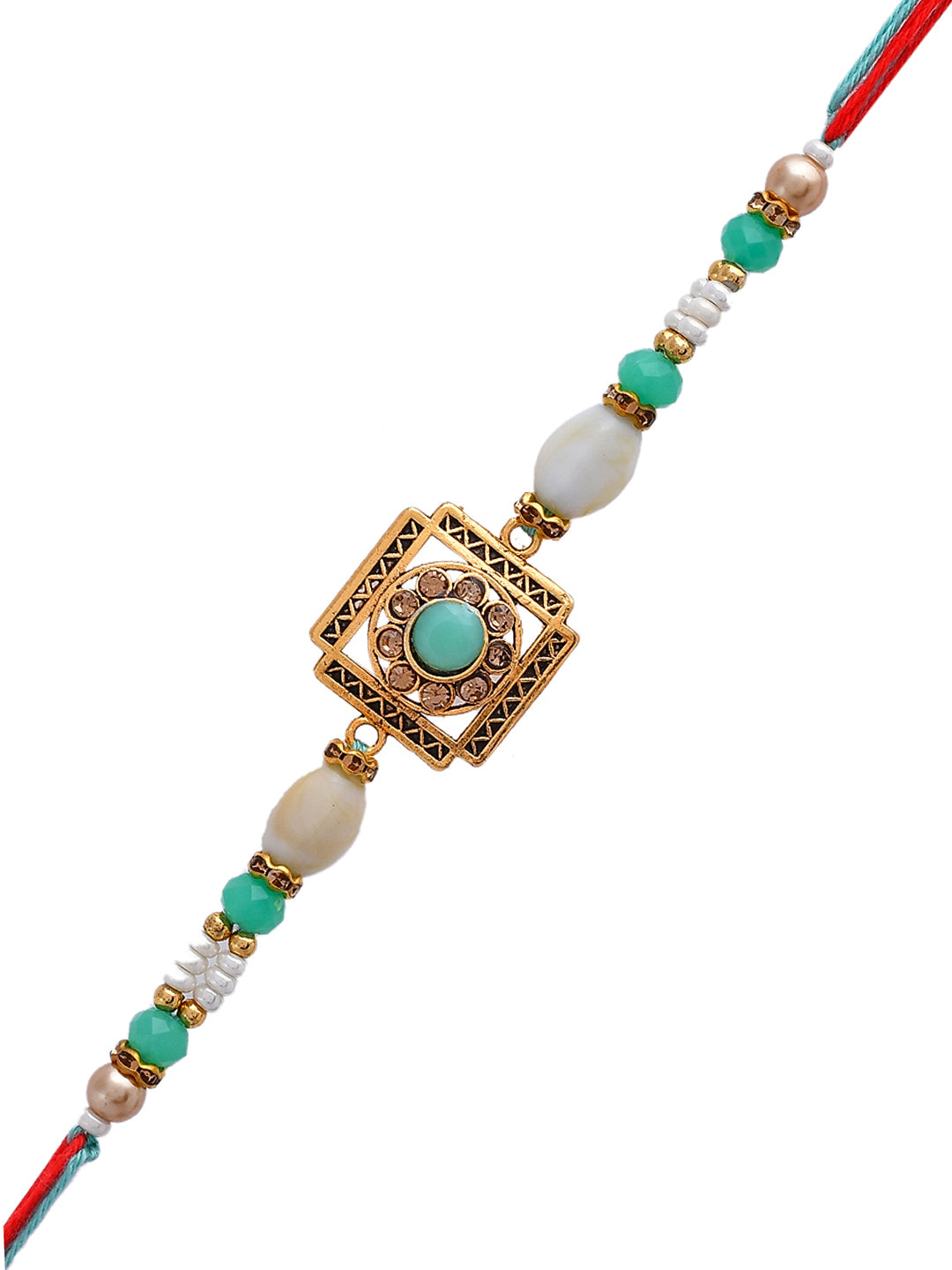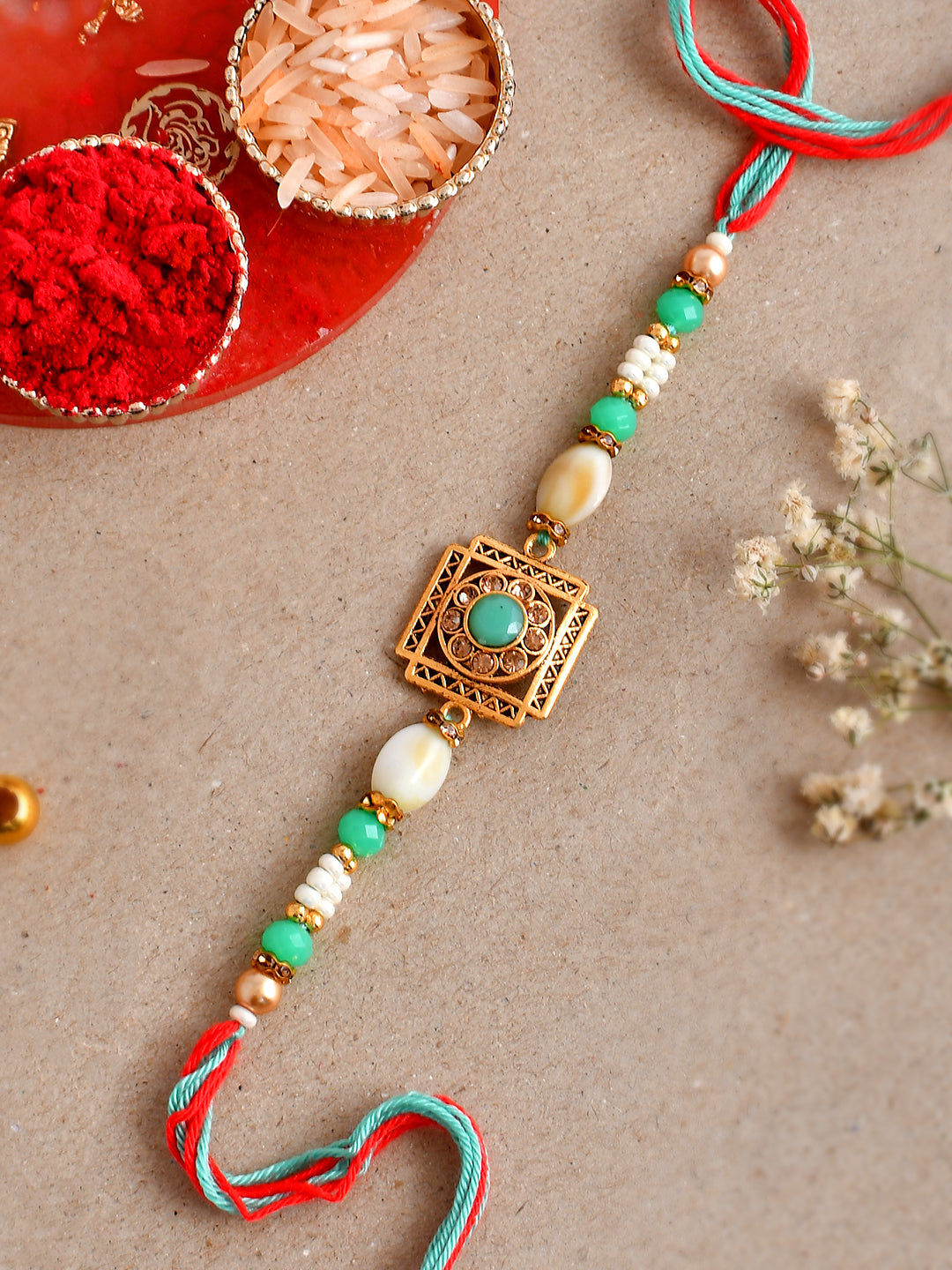 This Rakshabandhan, gift your loved ones the threads of protection - sacred rakhis by Aapno Rajasthan. Celebrate the eternal bond of sibling love with our exquisite collection of Rakhis. Each thread weaves together the emotions and memories shared between brothers and sisters, symbolizing a bond that transcends time. Our rakhis are meticulously crafted, blending traditional designs with a touch of elegance. Handcrafted with the softest material, these rakhis come in a wide range and are embellished with zardozi embroidery, pure natural rudraksha beads, American diamonds, sandalwood beads, freshwater Pearls in many shades, zari work, resham thread embroidery, beautiful kundans, and so on. There are also silver rakhis ornate with precious and semi-precious stones, authentic polki, exotic peacock feathers, and other exquisite embellishments. Rakhis will be shipped exactly as shown but in case of last moment shortages similar and equally good Rakhis will be shipped.