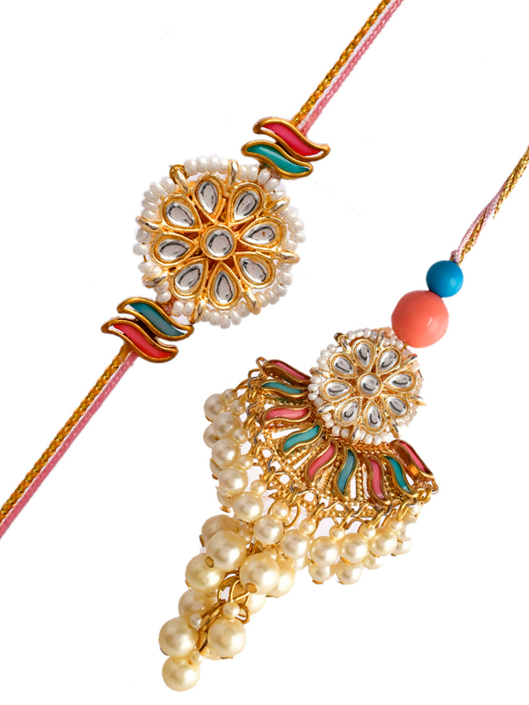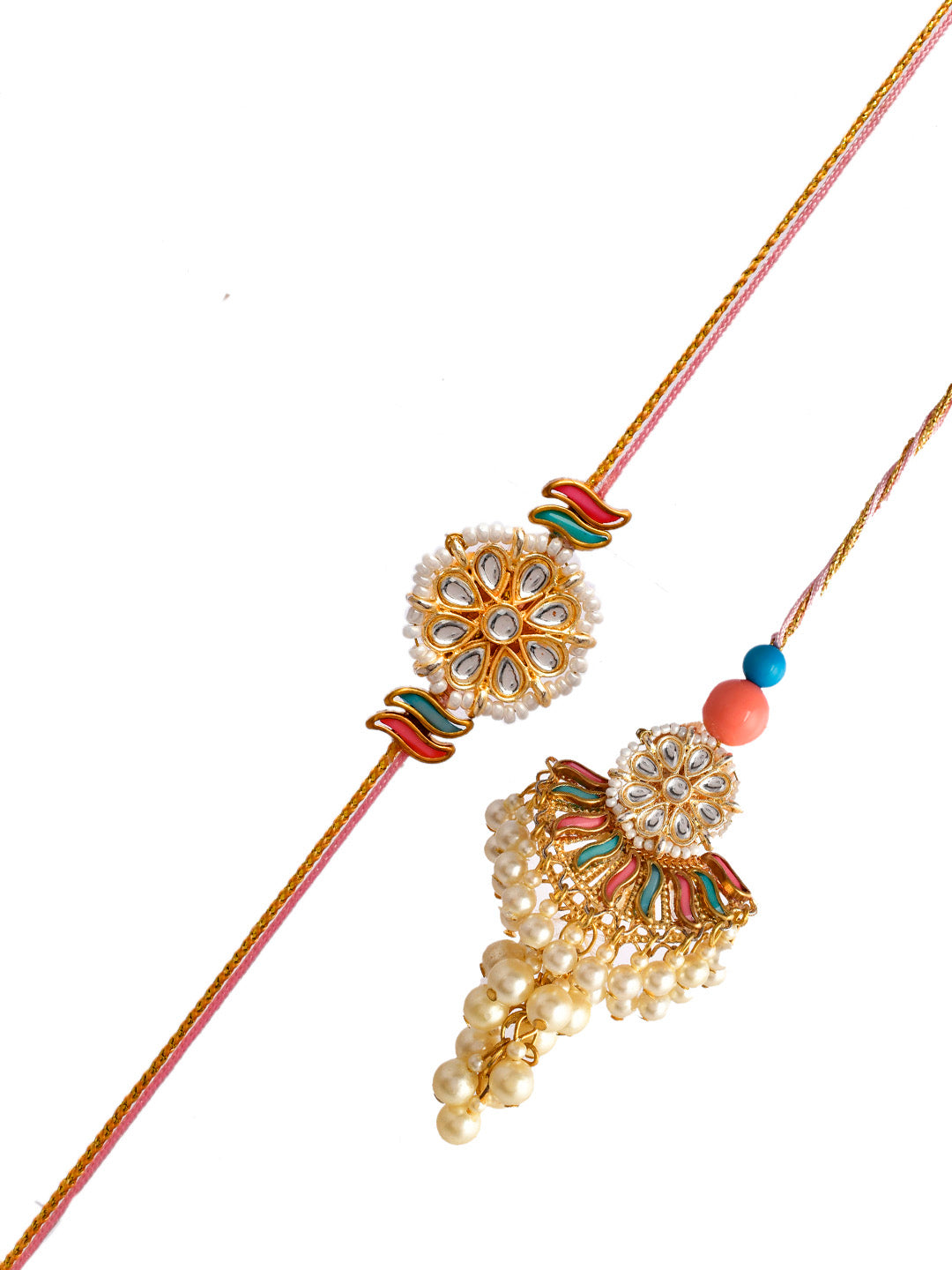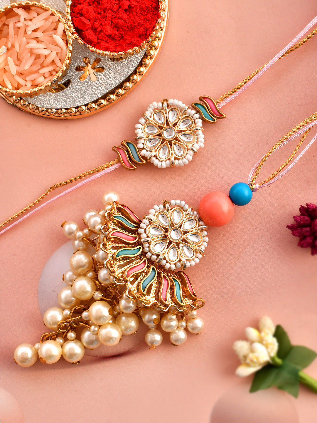 Kundan & Pearl Crafted Beautiful Pink and Blue Bhaiya Bhabhi Rakhi Set