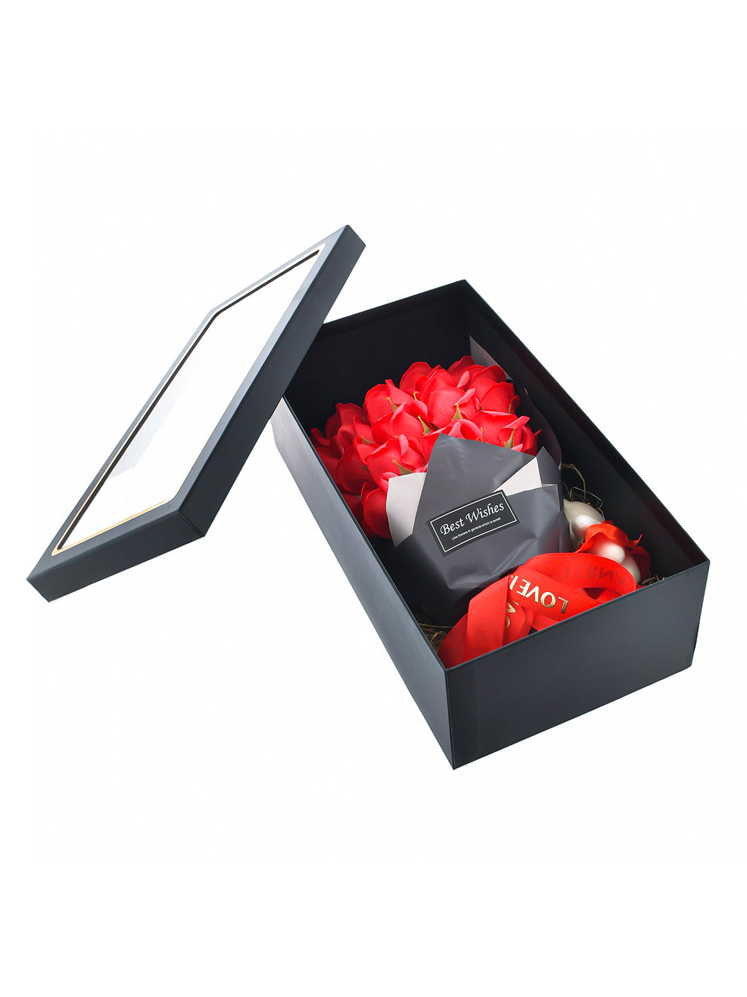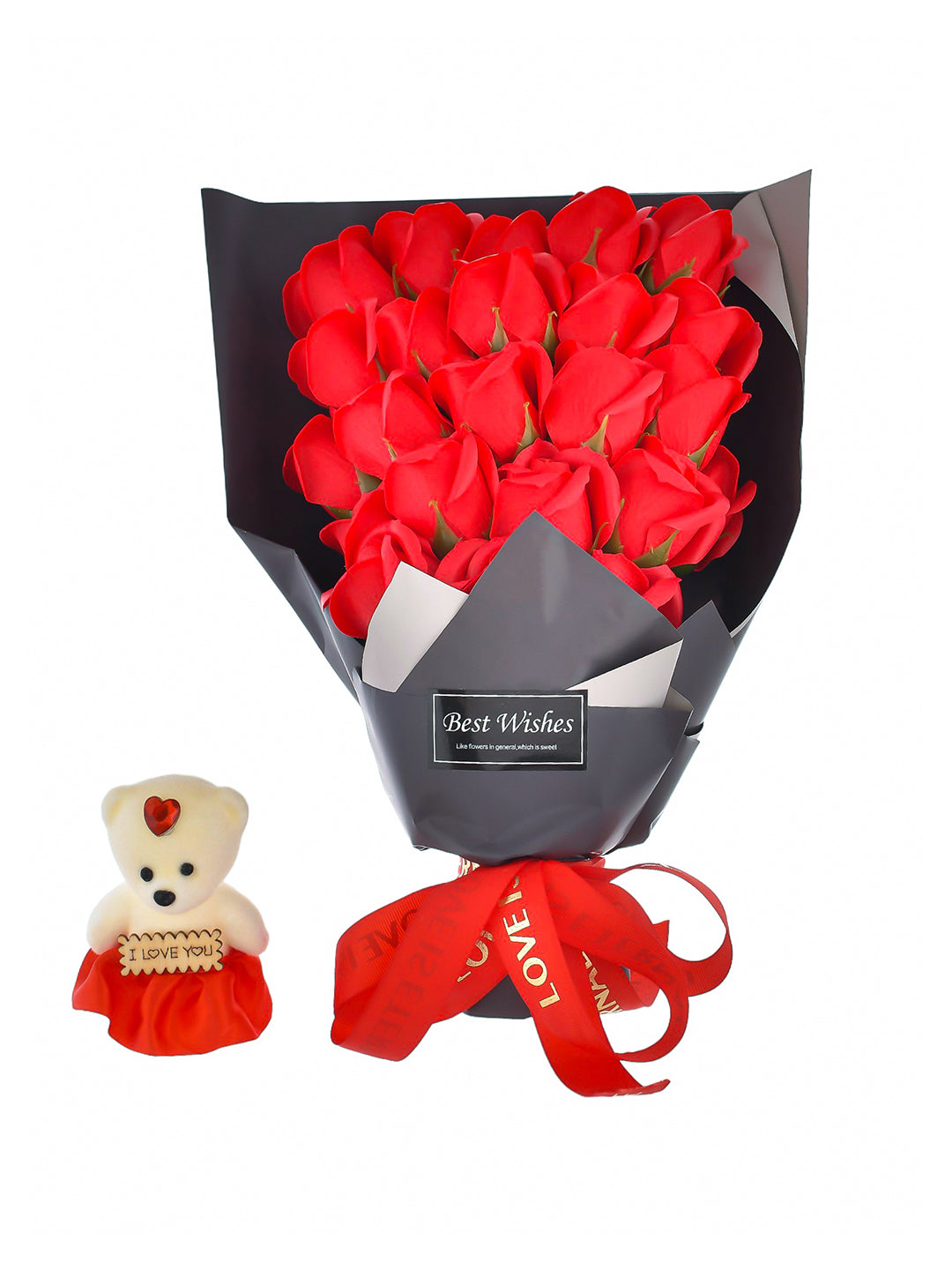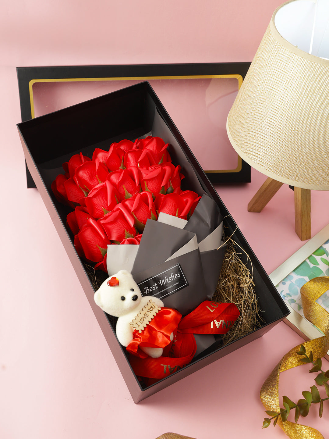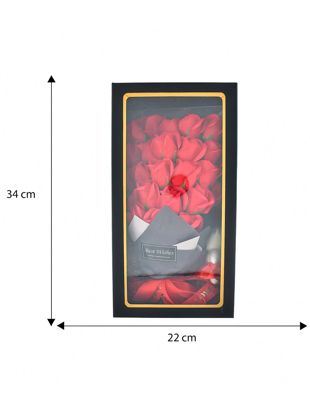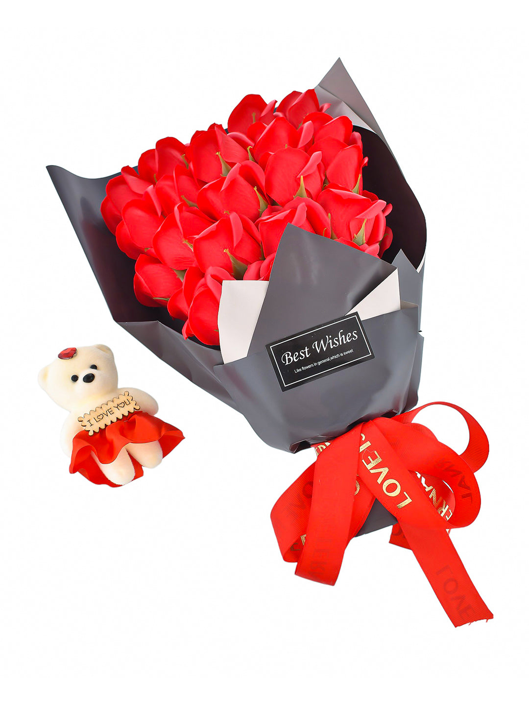Presenting the Love Blossom Teddy Roses Bouquet, a heartfelt ensemble that combines the timeless elegance of red artificial roses with the cuddly charm of a teddy bear. Carefully arranged, this bouquet gives romance and warmth, featuring stunning red roses that remain forever in bloom. Nestled with the bouquet is a lovable teddy bear, adding an adorable touch to the gesture of affection. Perfect for expressing love on valentine's or on special occasions or surprising a special someone, the Love Blossom Teddy Roses Bouquet is a beautiful and lasting symbol of love, bringing joy and tenderness to every moment it graces.