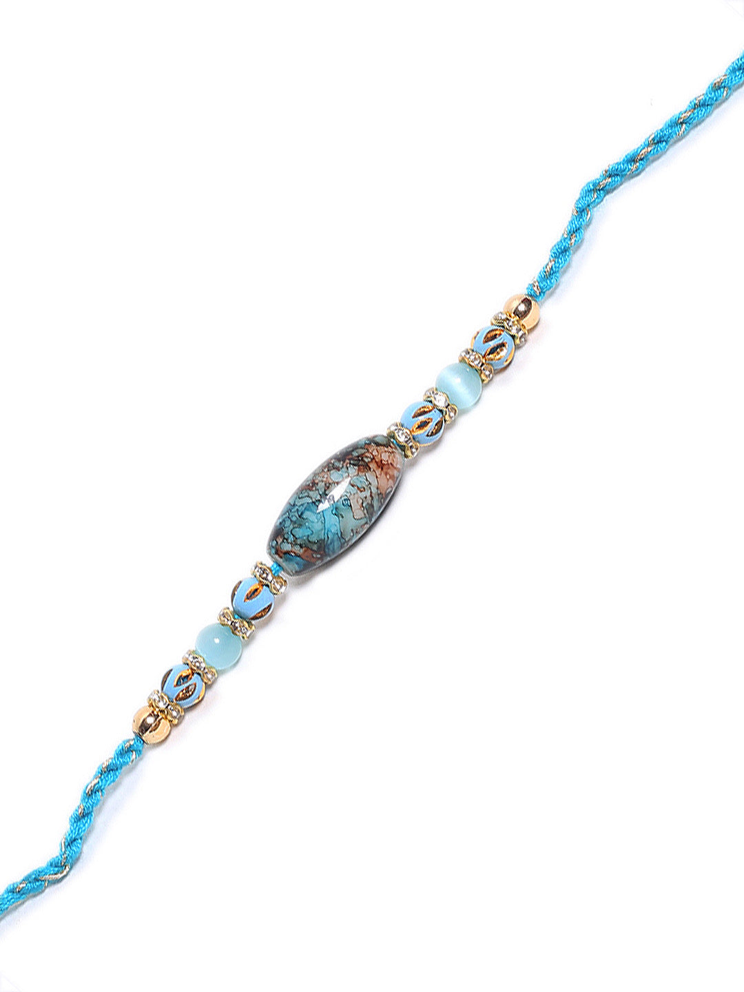 Marble Effect Blue Rakhi for this auspicious Raksha Bandhan to send to your beloved brother with Tilak Pack. Rakshabandhan is a festival of celebrating and honouring sibling love. AAPNO RAJASTHAN brings home-spun Rakhis prepared in the time honored tradition and with same love & care that matches sisterly love. Respecting the values that Rakhi represents we bring you Rakhis made with auspicious material like Mauli and woven with Rudraksh, kowdi, kundan, Zardosi etc.; Our exclusive collection have lovely handcrafted Rakhis made from Silver , Natural Sandalwood beads, American Diamonds, Pure natural Rudraksh, Enamel work, Golden beads , cut glass and crystals , Mauli , Zardosi , Zari and Resham work, Real Polki , Beautiful Kundans, Real Peacock Feathers , Precious and semi precious stones with Fresh water Pearls in many shades. Rakhis will be shipped exactly as shown but in case of last moment shortages similar and equally good Rakhis will be shipped. The Set Contains- 1 Premium Handcrafted Rakhi::1 Pack of Tilak::1 Paper Rakhi Card . Option of sending 200 Gms Kaju Katli is also available with this product. Brand- Aapno Rajasthan
