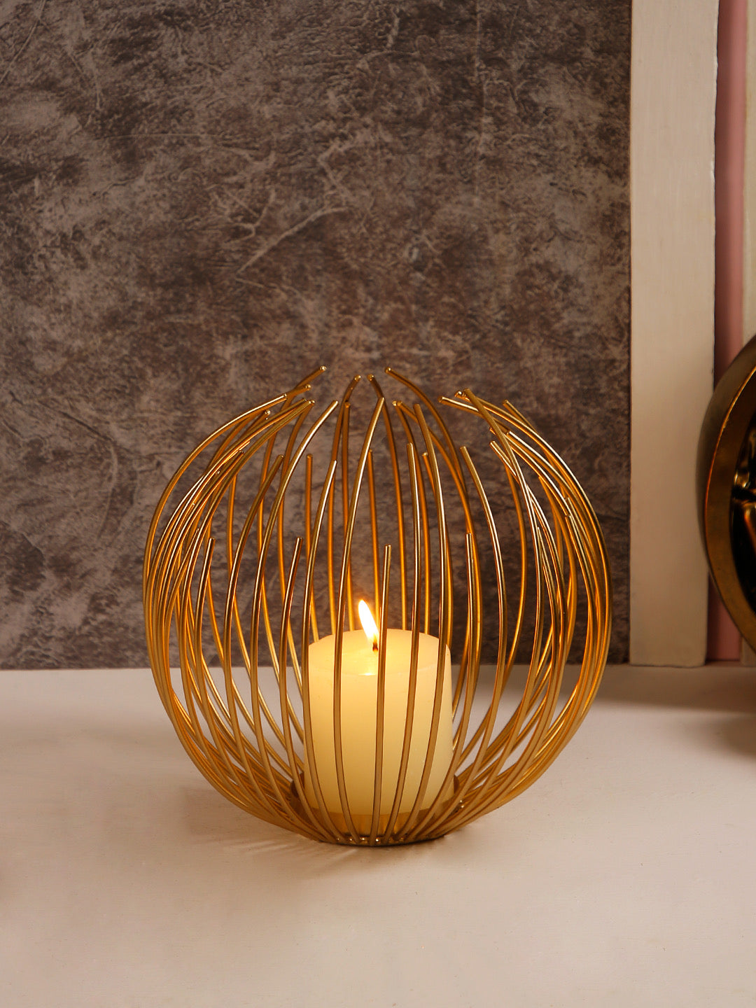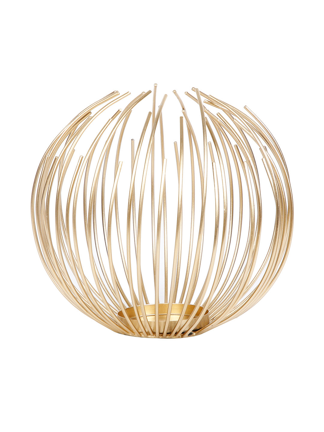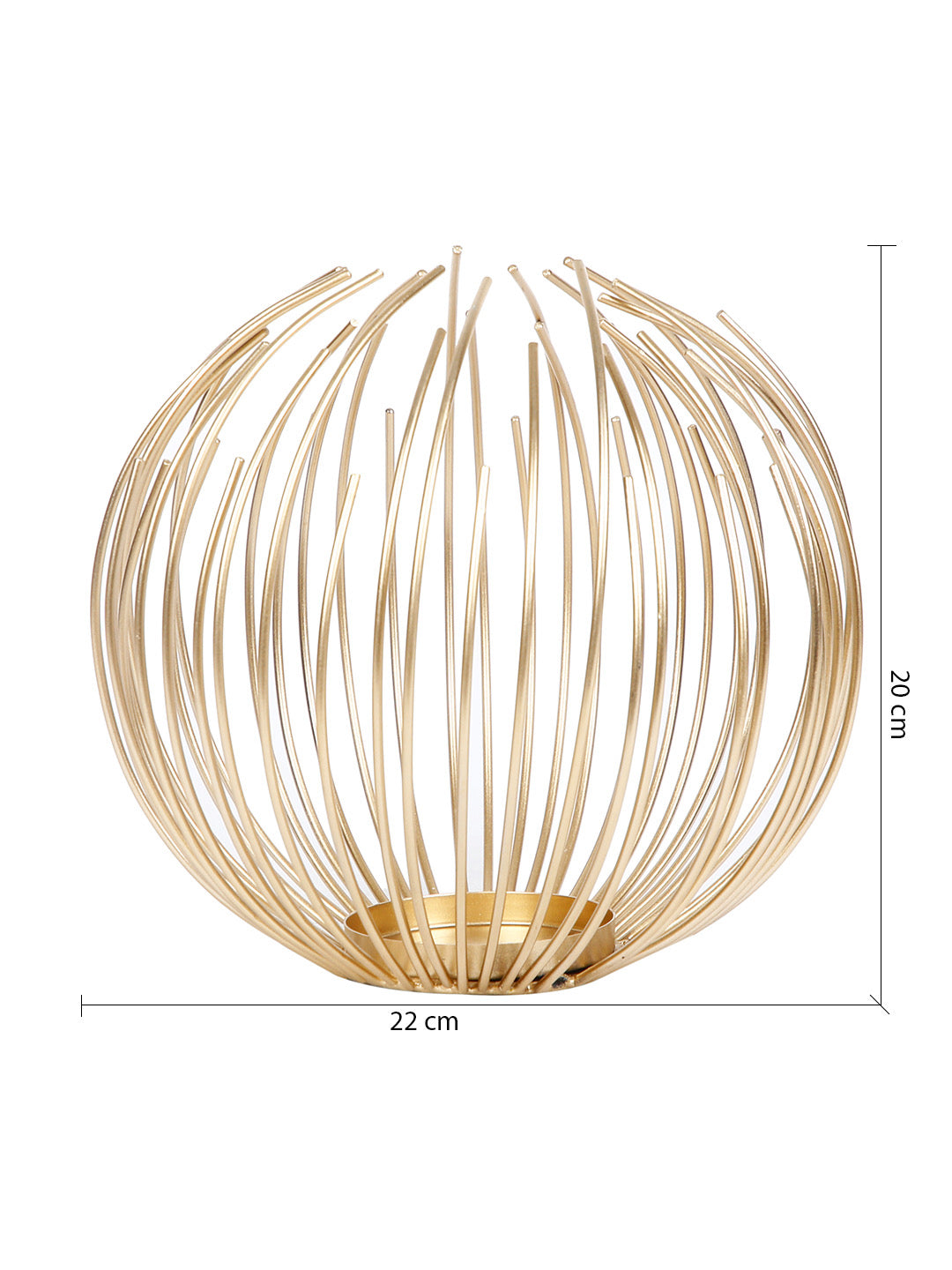 • A tealight featuring open-from-the-top, asymmetrical wire sphere which surrounds a candle holder plate.