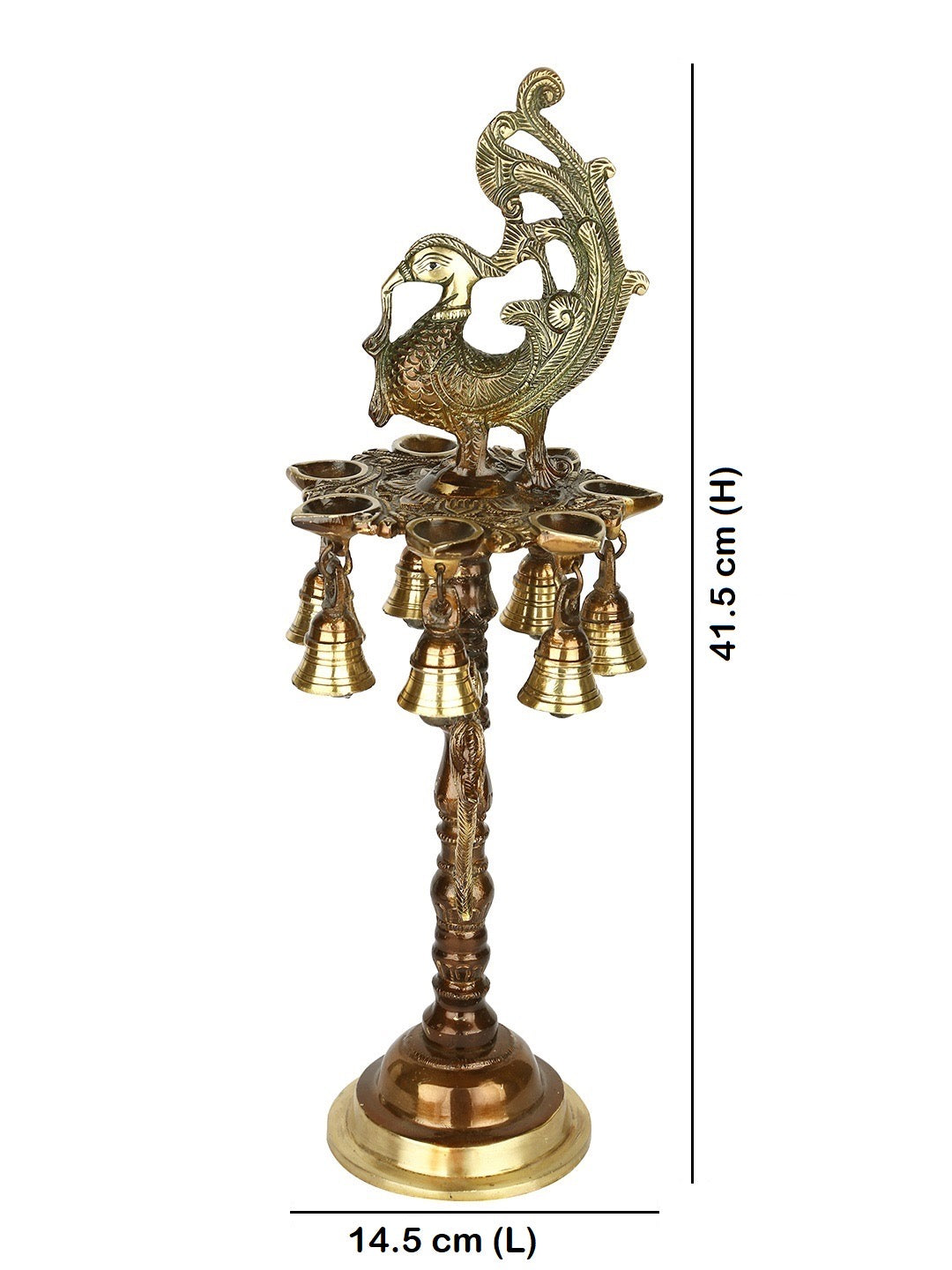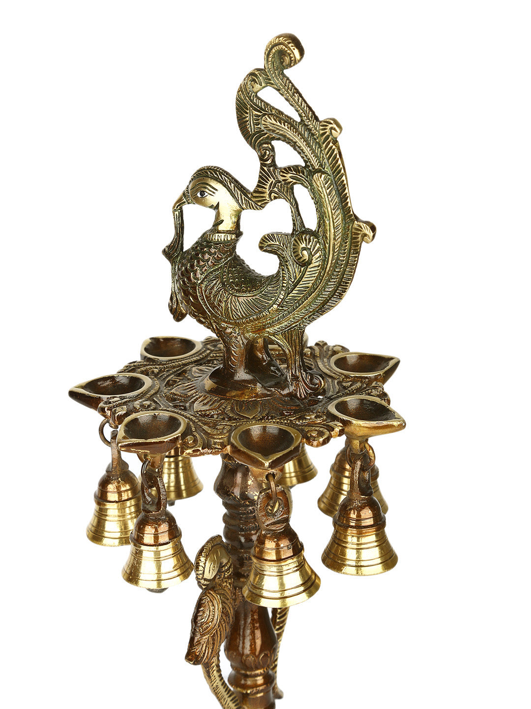 • With an antique finish, bells and a peacock on it's top, this lamp is an utilitarian accessory.