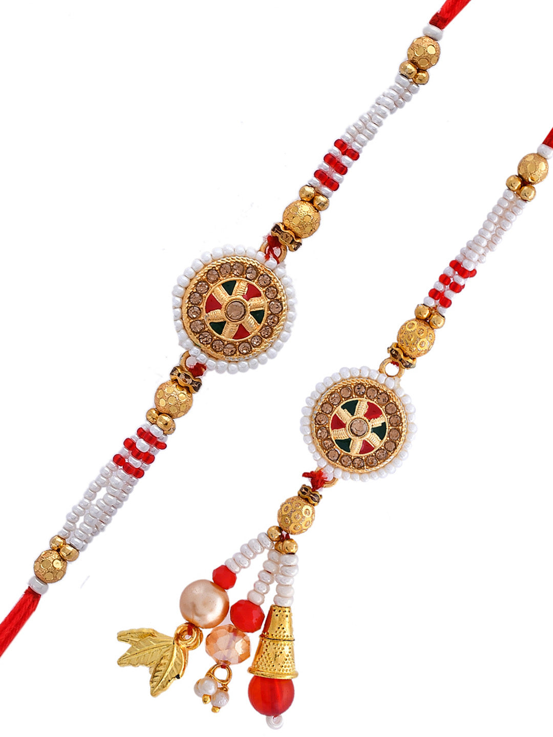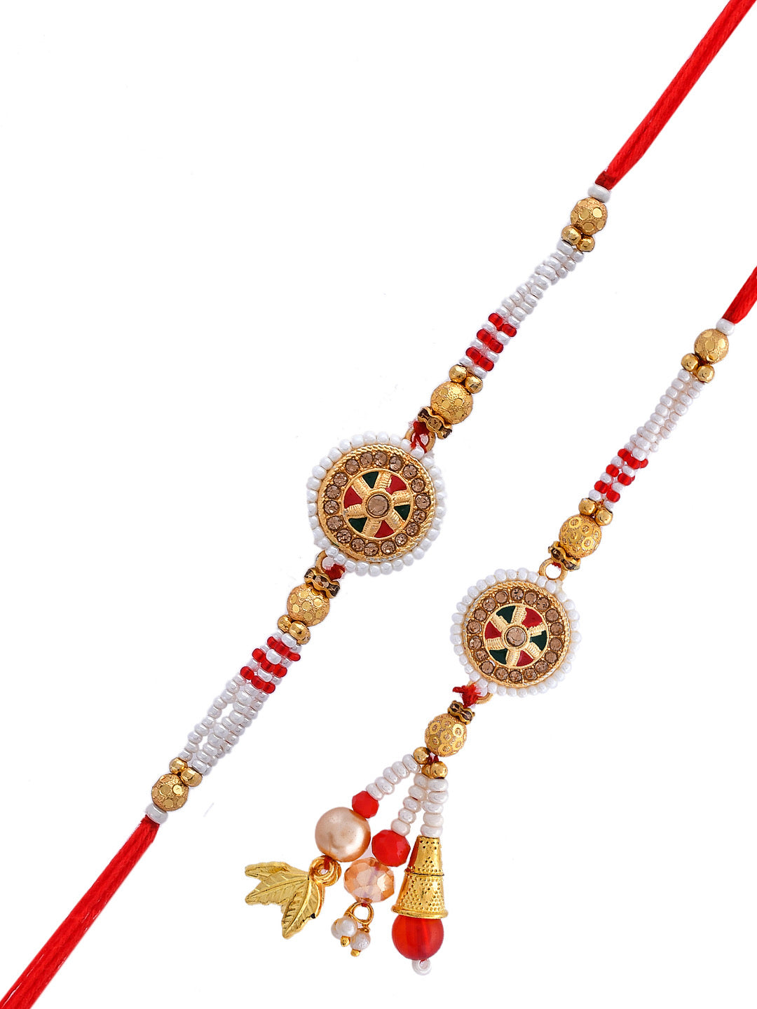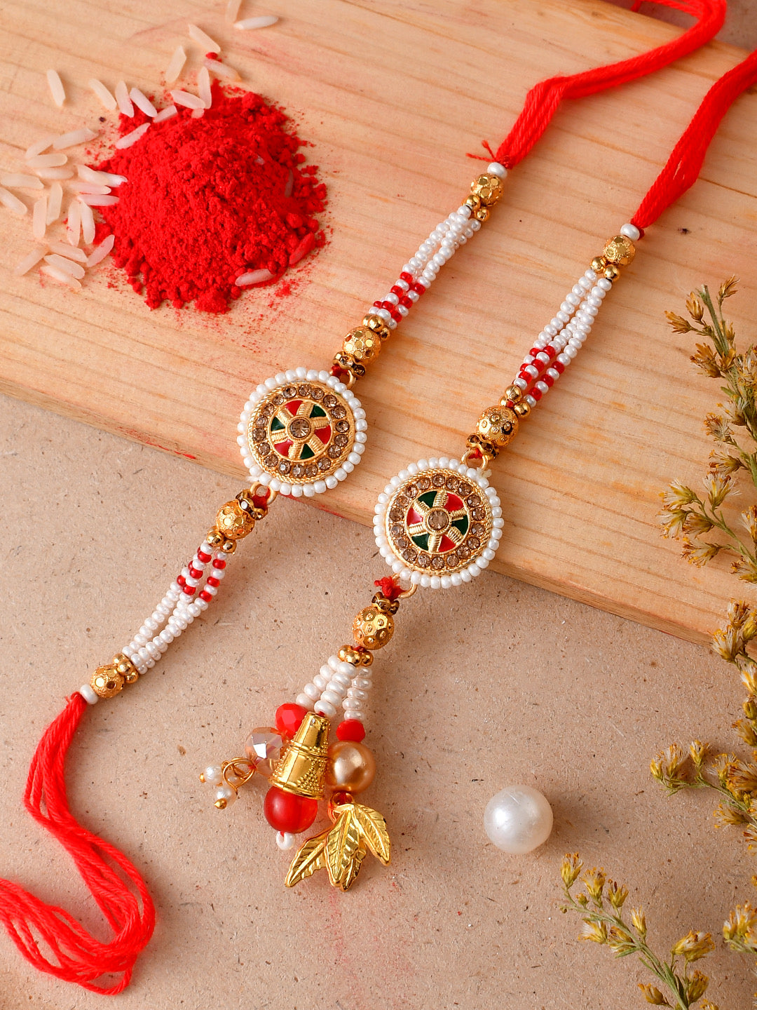 Red and Gold Traditional Bhaiya Bhabhi Rakhi with Pearl Embellishments
