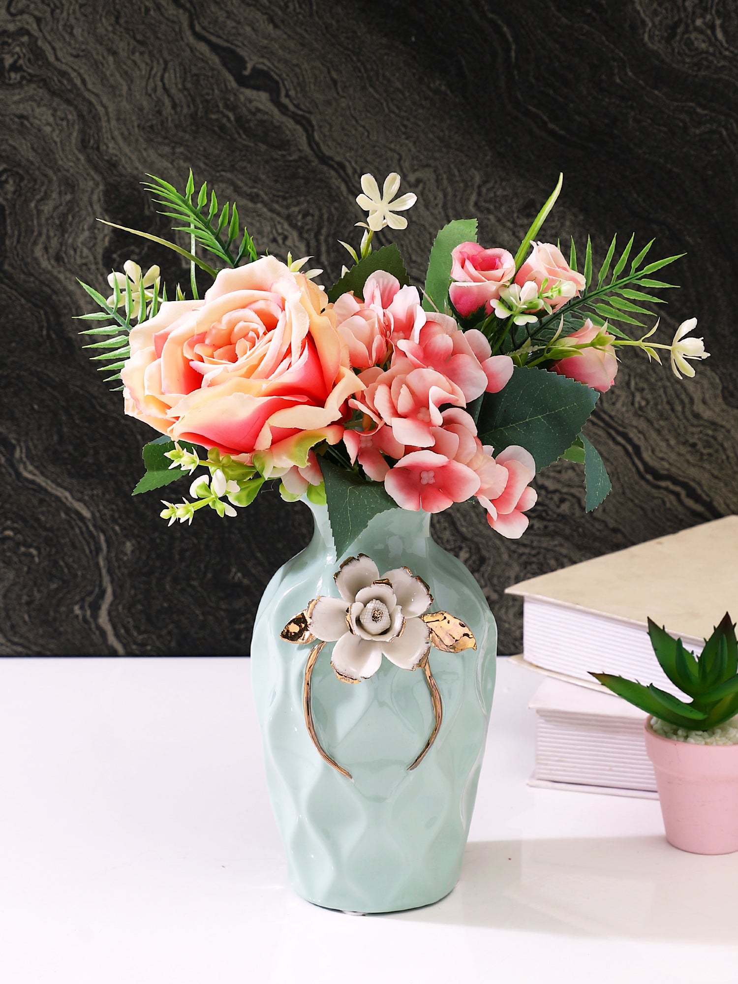 Exquisite artificial blush pink roses paired with delicate fillers and lush green foliage, radiating timeless beauty. Perfect for adding elegance to your decor or gifting to express love and admiration.