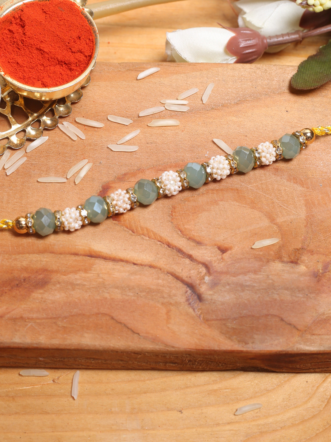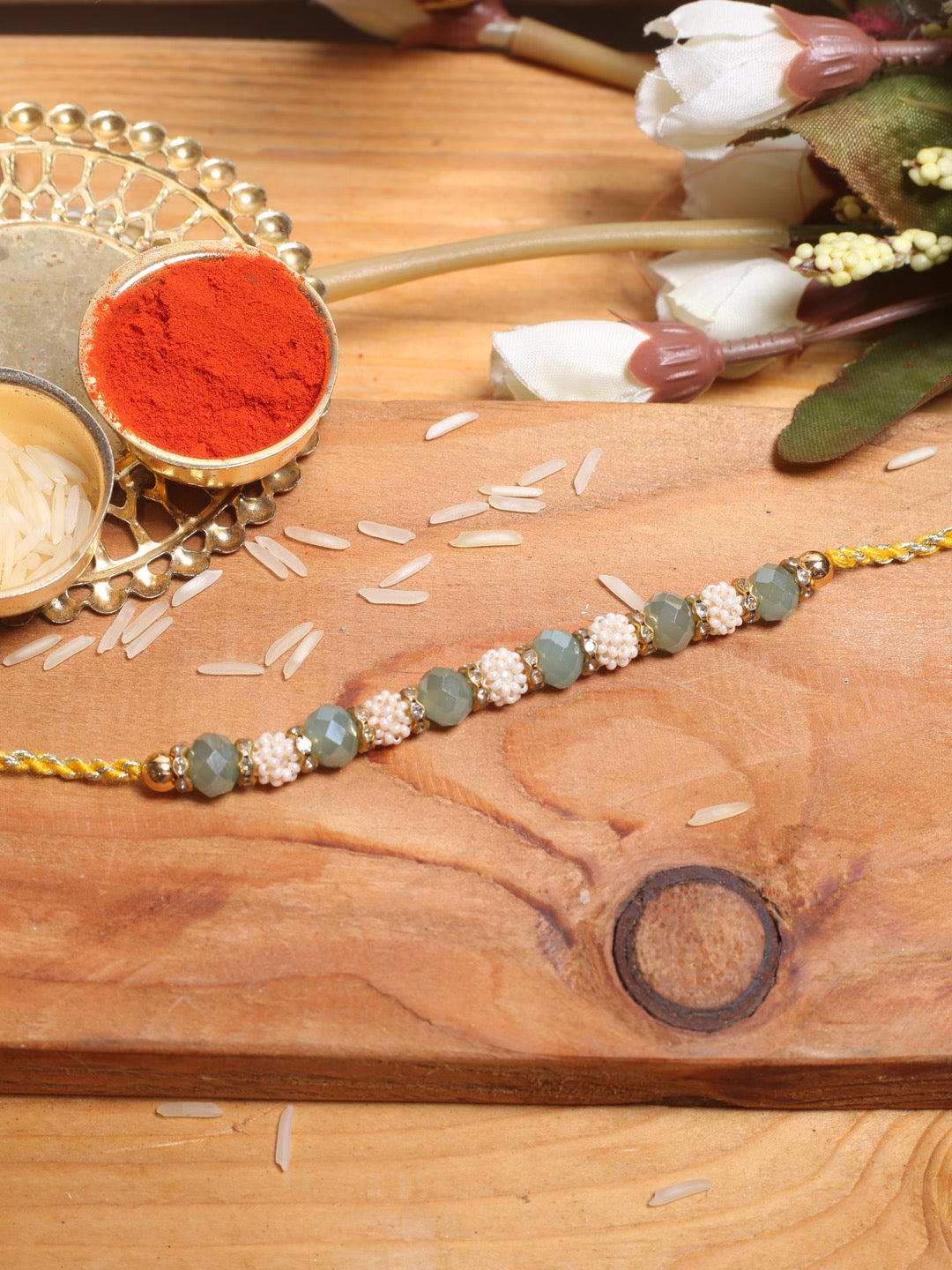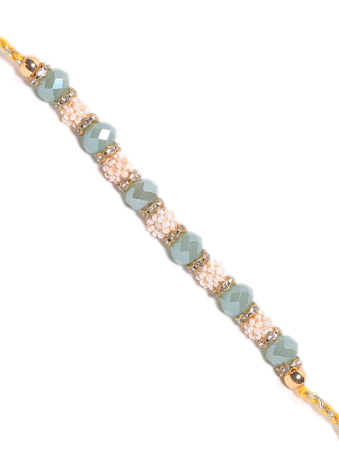 White Flowes Rakhi with Blue Beads for this auspicious Raksha Bandhan to send to your beloved brother with Tilak Pack. Rakshabandhan is a festival of celebrating and honouring sibling love. AAPNO RAJASTHAN brings home-spun Rakhis prepared in the time honored tradition and with same love & care that matches sisterly love. Respecting the values that Rakhi represents we bring you Rakhis made with auspicious material like Mauli and woven with Rudraksh, kowdi, kundan, Zardosi etc.; Our exclusive collection have lovely handcrafted Rakhis made from Silver , Natural Sandalwood beads, American Diamonds, Pure natural Rudraksh, Enamel work, Golden beads , cut glass and crystals , Mauli , Zardosi , Zari and Resham work, Real Polki , Beautiful Kundans, Real Peacock Feathers , Precious and semi precious stones with Fresh water Pearls in many shades. Rakhis will be shipped exactly as shown but in case of last moment shortages similar and equally good Rakhis will be shipped. The Set Contains- 1 Premium Handcrafted Rakhi::1 Pack of Tilak::1 Paper Rakhi Card . Option of sending 200 Gms Kaju Katli is also available with this product. Brand- Aapno Rajasthan