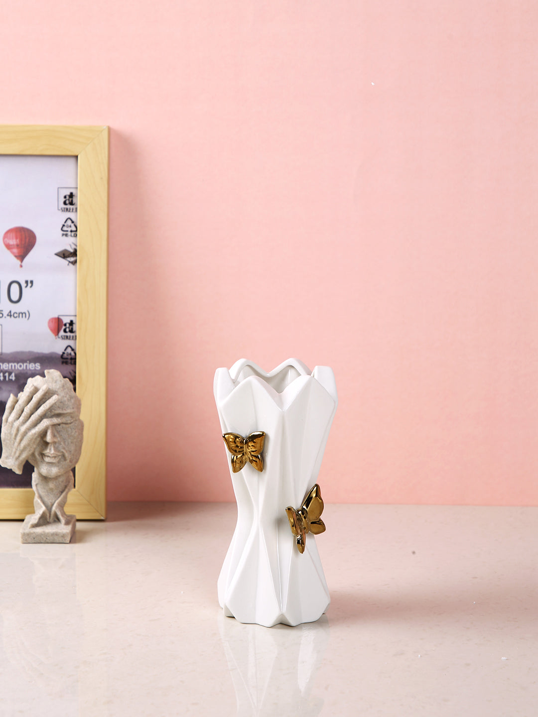 A blend of art and function, the Butterfly Bloom Sculpture Vase showcases a dynamic, sculpted form with flowing curves and gold butterfly accents. The textured finish enhances its luxurious appeal, making it an exquisite addition to elegant interiors and an ideal gift choice.