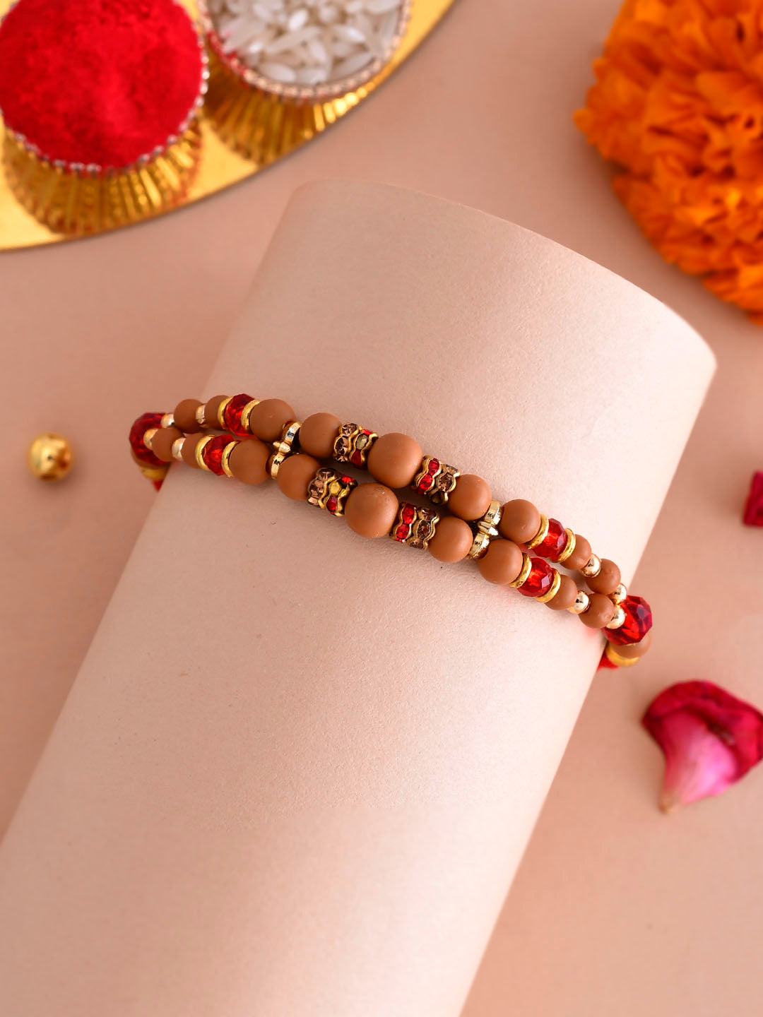 Wooden Beaded Rakhi with Golden Rings