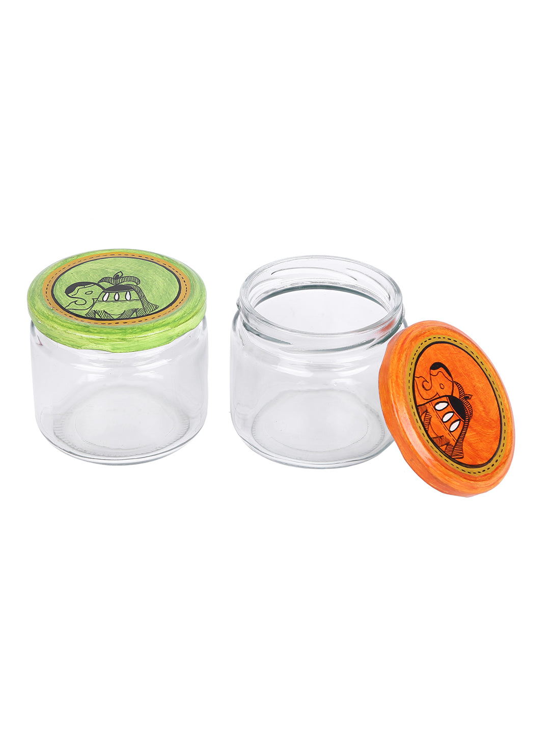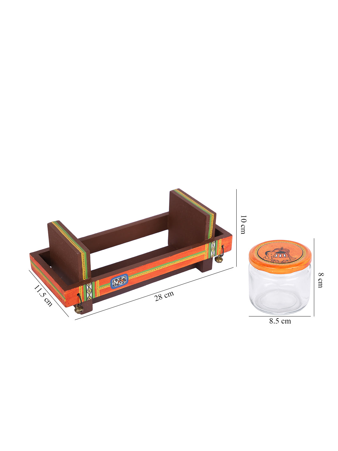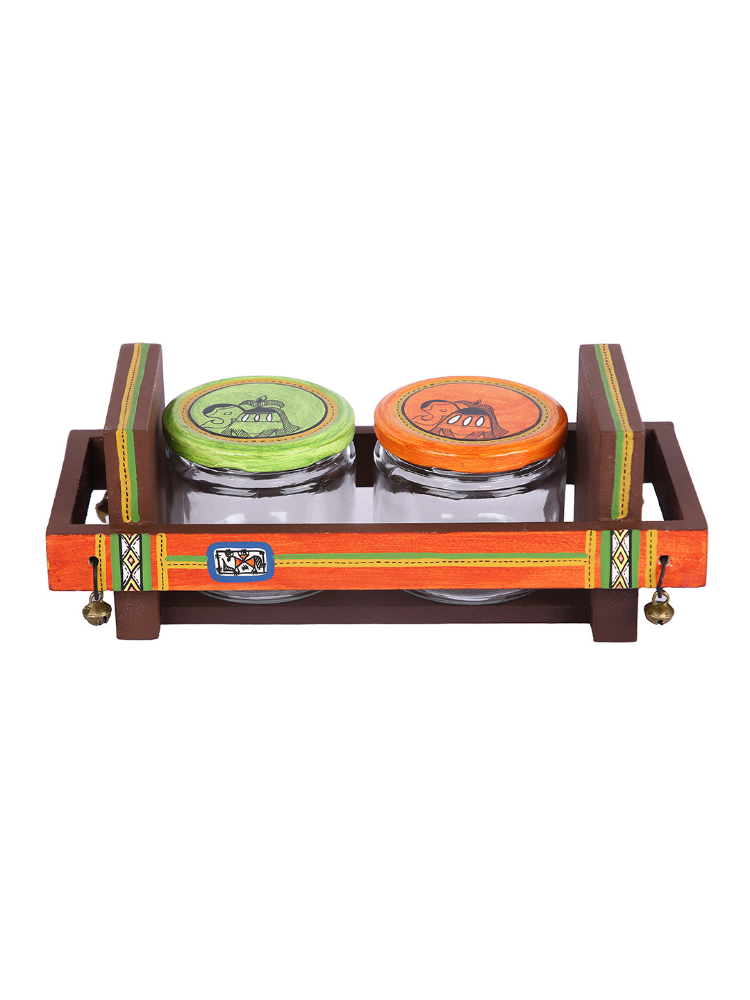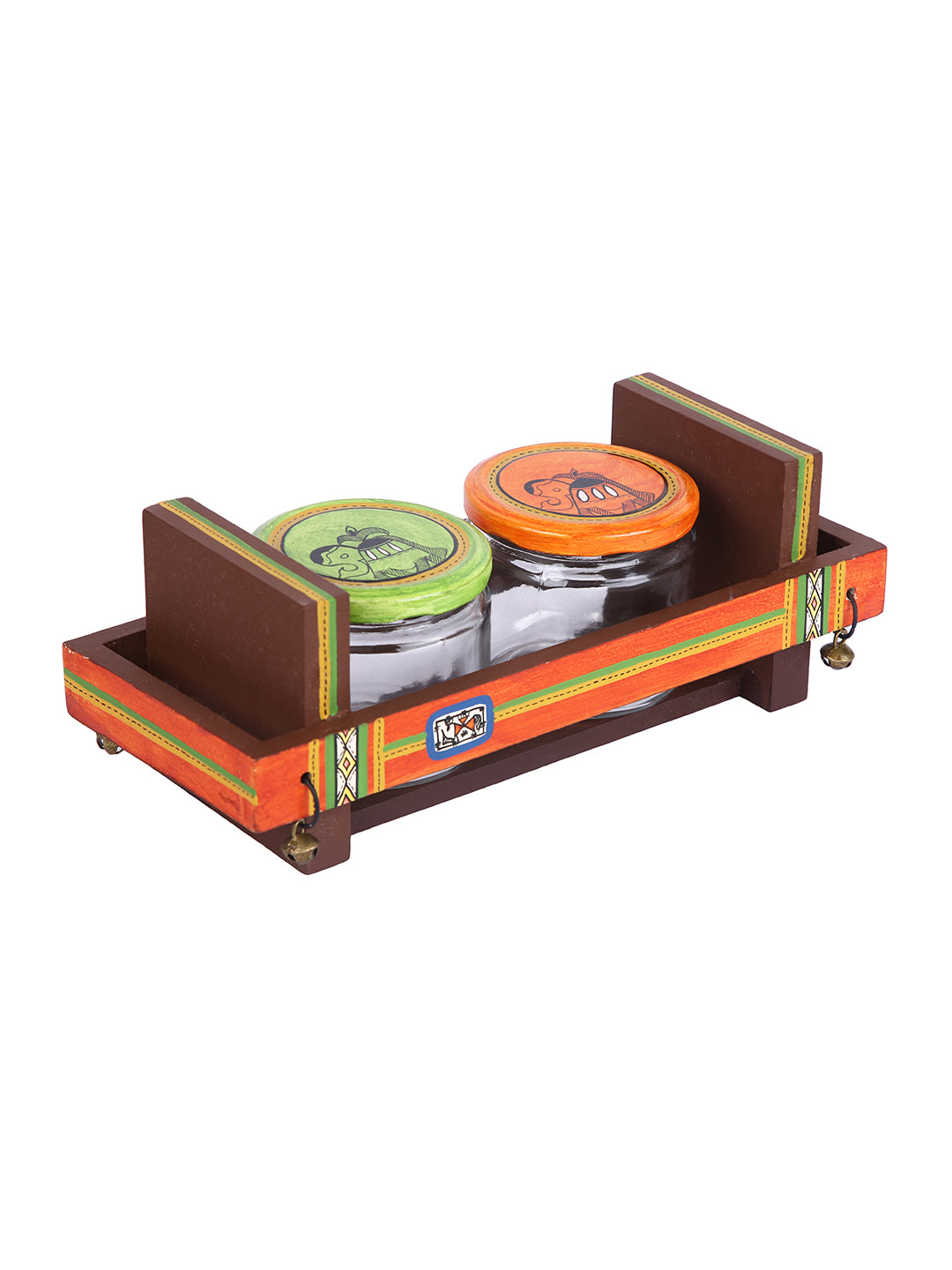 Material- Metal Dimensions- 11x4.5X4 Description- • This creative tray with cute jars is a perfect table setting to elevate the look of your table while dining with family and friends. The jars helps in storing pickles, dry fruits and sauces while the tray makes it is easier to carry around. • This vintage tray is beautifully handcrafted and hand-painted with Madhubani art giving it a traditional look overall. The lids of the jars comes in bright colors and are hand-painted with fine art. • This vintage looking tray come with set of two big jars. Disclaimer- • As this product is handcrafted there might be a slight variations which is natural outcome and hence makes the product unique. • Wipe off the dirt with a soft cotton cloth.